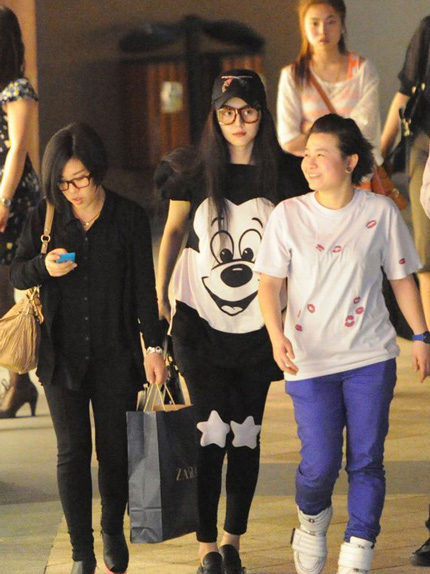 Tối qua 24/6, người ta bắt gặp Phạm Băng Băng cùng người quản lý đi mua săm tại một trung thương mại bằng chiếc Mercedes-Benz đắt tiền của cô. Nữ diễn viên 31 tuổi mặc áo phông thụng có in hình nhân vật hoạt hình chuột Mickey, quần jeans ôm và giày thể thao, cùng gương mặt hầu như không trang điểm.
