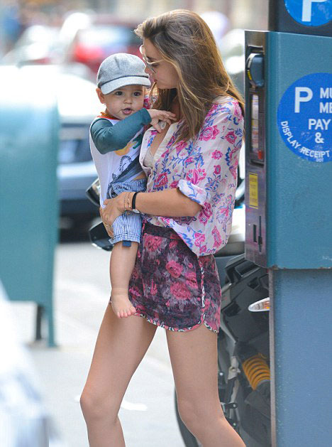 | Miranda Kerr và con trai 18 tháng tuổi trên phố New York, ngày 24/6. "Thiên thần" của hãng nội y Victoria's Secret khoe vòng một quyến rũ và chân dài sexy trong bộ đồ hoa. |